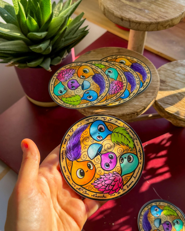 Ces dessins sont réalisées par mes soins sur tablette graphique et ensuite imprimés par un imprimeur spécialisé. Ces stickers résistent aux projections d'eau et aux rayures mais afin de les garder aussi brillants et de couleur vive je déconseille de les coller sur une surface extérieure (exemple carrosserie de voiture) ou sur un objet du quotidien qui subit beaucoup de frottements intensifs (exemple porte clefs).